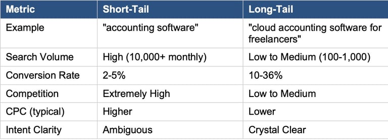 This distinction fundamentally changes campaign economics. Short-tail keywords (one to two words) cast a wide net with high volume and fierce competition. Long-tail keywords (three or more words) are specific, lower volume, but dramatically more profitable.